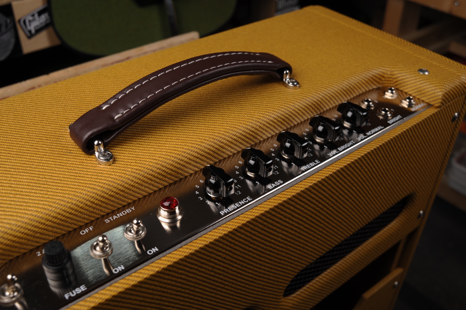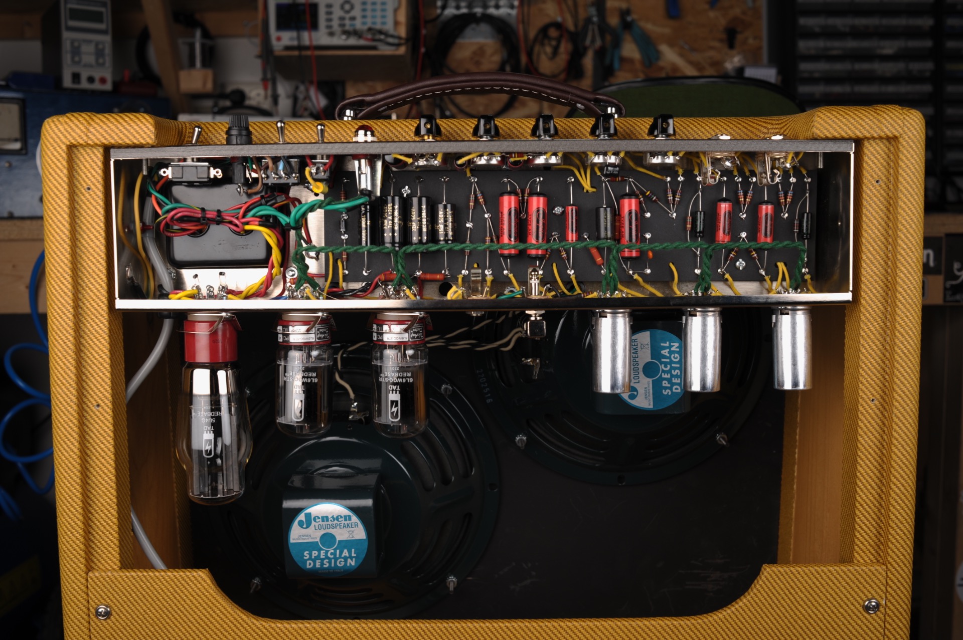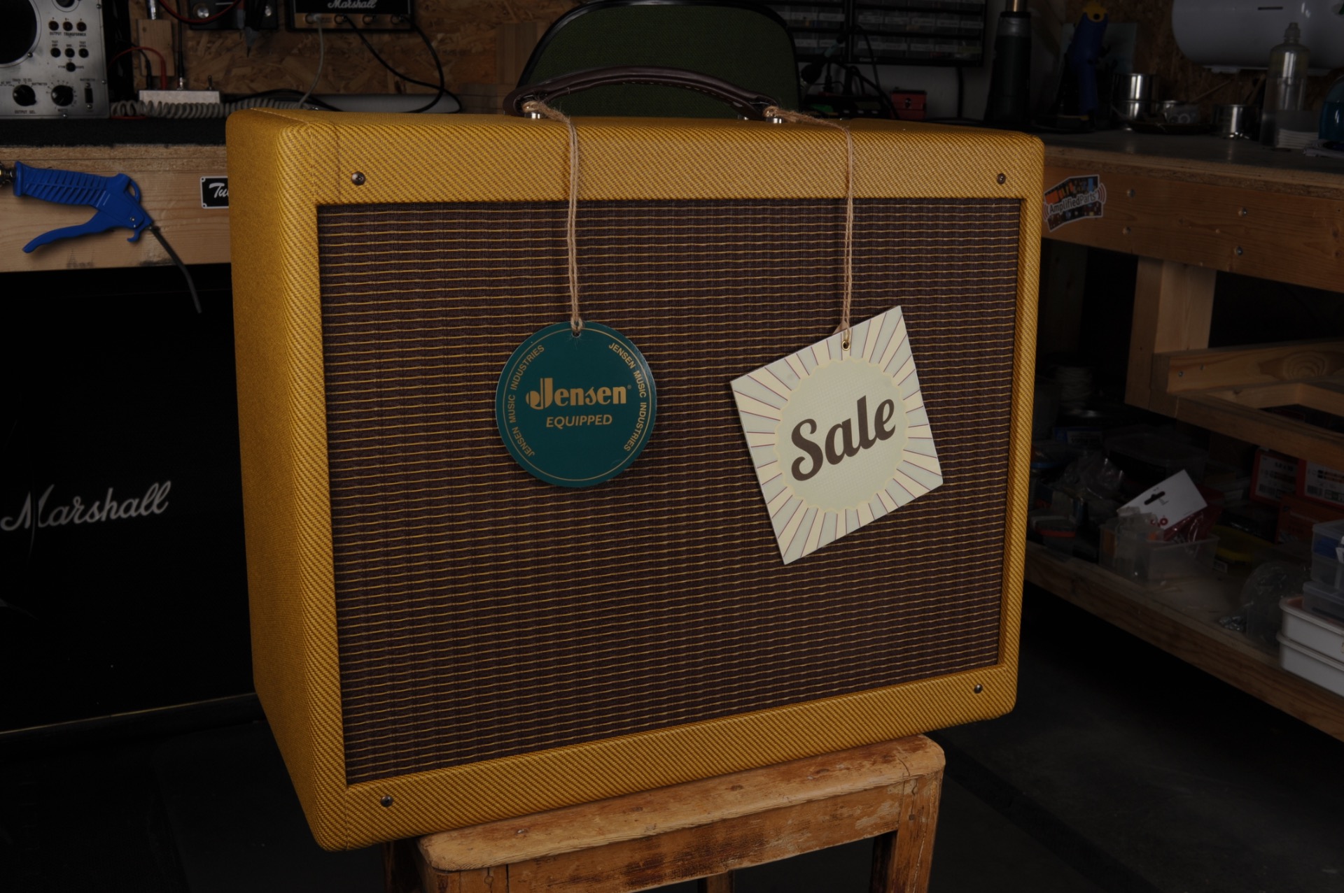Tweed Super 5f4 til salgs! Denne er nettop bygget på verkstedet, og er klar for en som ønsker seg noe helt spesielt. Denne gir 27 cleane watt og 38 overstyrte watt. Forsterkeren er satt opp med F&T (store) og sprague (små) elektrolyttkondensatorer, fullt kit med Jupiter «red astron» kondensatorer, belton rørsokler og rørclips, carbon kompositt-motstander, og 2 stk 10 tommer jensen alnico høyttalere. Kabinettet er håndbygget i usa, er fingerskjøtt og er i heltre.
